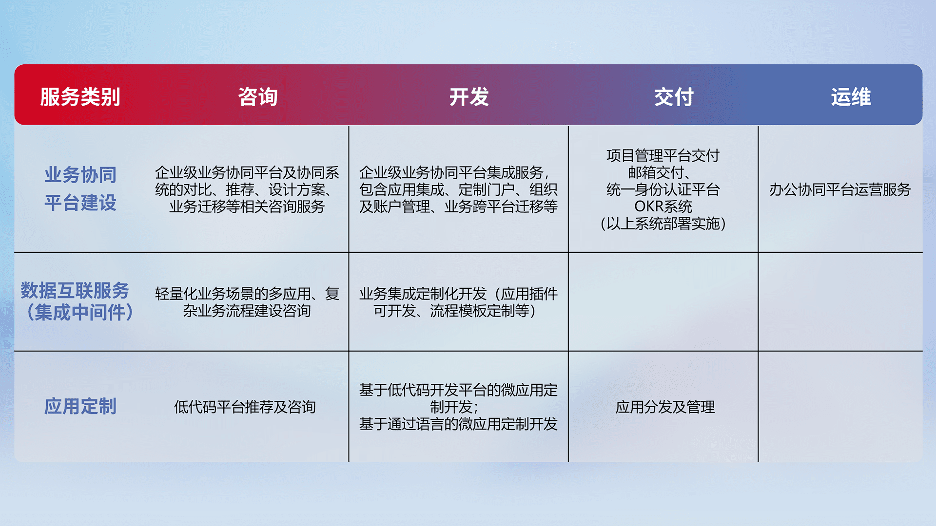 针对钉钉、、、、企微、、、IDaas等平台级产品提供产品的规划、、、、方案、、交付、、、定制化开发等服务,,实现如统一协同办公、、智能客户服务、、混合会议管理、、智能数据查询、、、、等业务场景,,,,实现数字化转型。。
